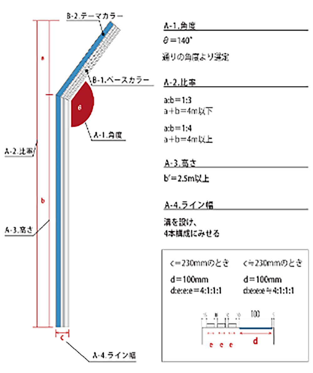これは、エリアマネジメントをおこなう事業のデザインに反映されています。各通りの現状を整理し、通り毎のイメージに合わせてコンセプトとテーマカラーを選定することで統一感を出しつつ、各通りの特徴を表現することを意図しています。
