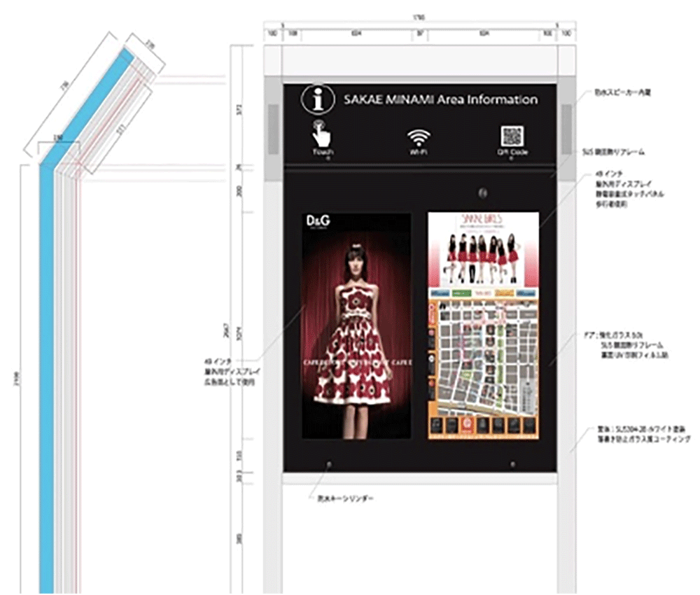 栄ミナミは他エリアにはない特徴として、通りの形状が屈折しています。「くの字」をモチーフと設定し、ロゴやデザインに展開しています。